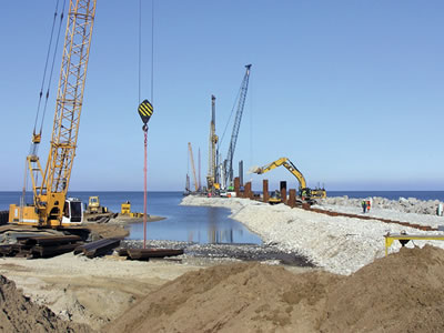 od lipca 2010 do dnia dzisiejszego wykonujemy roboty inżynierskie oraz podnajmujemy maszyny budowlane na budowie Falochronu Osłonowego Portu Zewnętrznego w Świnoujściu.